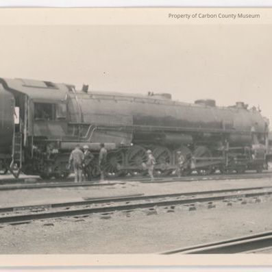 Update 5/2010: Black and white print of a train locomotive, possibly a Challenger-class. It is long and is followed by a car with a Union Pacific Overland logo emblem on the side. Men are standing beside engine. More sets of tracks are in the foreground.Collection