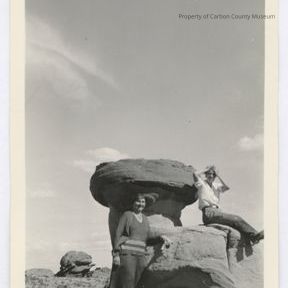 Update 1/2010: Black and white print. Snapshot. Image of two women and a large wind carved sandstone formation. One woman is standing in front of the rock. She is wearing a dark 2-piece dress with lighter stripes on hem of blouse and large hat and dark boots . Second woman is seated on right side of rock with her hands upon her head. She is dressed in light pants, white shirt and knee-high boots. Other large rounded boulders in background. Sparse vegetation between rocks. Woman at right is the same as seen in 1948.042.0044 and identified as Gerry Brimmer.