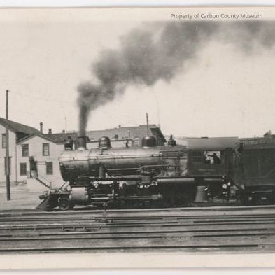 Update 5/2010: Black and white print of a steam locomotive. It is billowing black smoke and has "295" painted on the side and top. On photo left behind tracks is a large clapboard building. Most likely in Rawlins yard because partial lettering on extreme left reads "HAMBRA BAR" (the Alhambra Saloon). The corner of a brick building is on photo right.Collection