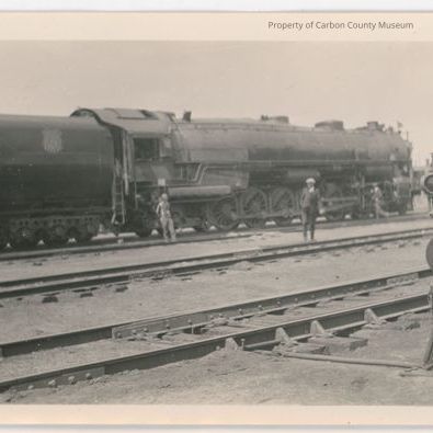 Update 5/2010: Black and white print of a steam locomotive, possibly Challenger-class, with a Union Pacific Overland logo emblem on the side. Two workers are beside engine and another man dressed in a suit is crossing the tracks. In photo foreground is a signal light mounted on a metal stand with a pipe toward tracks. Two sets of tracks are across photo center.Collection