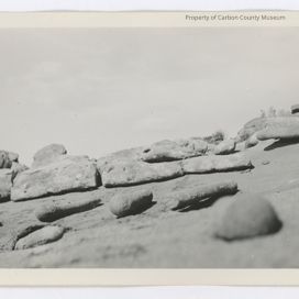 Photo of sandstone formations done by the wind at Windy Hill, north and west of Rawlins about 20 miles. Taken June, 1934.