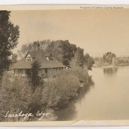 Update 5/2010: Black and white print card of a river flowing beside a house that is close to the bank. House is nestled amount trees, has a four way roof with dormer windows. A porch over hangs visible sides and a large chimney sets on top of the roof. Written in white on original negative: "Saratoga, Wyo. 37".