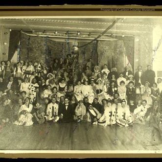 Update - January 2010: Black & white print. Snapshot. Mounted on tan & brown matboard. Image of a large group of people dressed in costumes posed in front of a stage. Wood floor visible in foreground. Stage opening has lights mounted on sides & top; row of Jack-o-Lanterns across opening with decorative fabric pieces hanging behind.