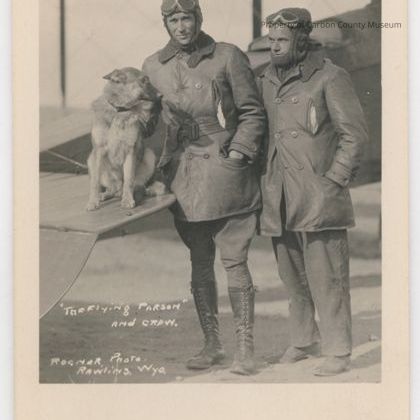 Written on original negative at lower left: ""The Flying Parson" and crew." "Rosner Photo, Rawlins, Wyo."