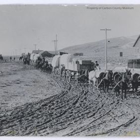 Photo of Ralph Bell Corrals and a string of freight wagons and teams ready to go to Lander and Casper. 1904. House on the right is C. J. Ehrenfields.