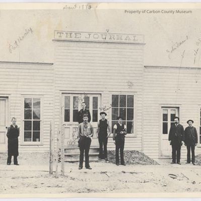 Update 2009: Black and white print of newspaper office on 200 block of 4th street. A clapboard building with sign on top that reads: "The Journal". Sign on door reads: "No Admittance". Seven men stand in front of building, one on left identified with pencil line and name above his head, as pat Healy. One man on right identified with line and his name above head as John Friend. Another as Peck. Other names unreadable. Written on top border in pencil: "1883". Written on print in pencil names of men in photo. Written on back in pencil: "Exterior Rawlins Business Houses." Home of the Journal, Rawlins weekly newspaper. Paper started in 1879. Building was on 4th street between Cedar and Front Streets." "Photograph believed to be after 1883 because print shop was built that year Dan & Rans:" "Carbon County Journal Bldg built prior to March 1880 north addition built April 1881 South Addition built 1883. Photograph about 1883. Block 22, South portions of lost 11, 10, 9." In red pencil: "Copied by State and Mounted."
