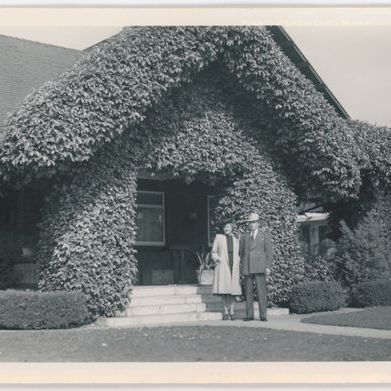 Update 5/2010: Black and white print of a man and woman standing outside in front of vine covered house. Vines are growing up two pillars and all across soffit, fascia and eaves of the house. Low bushes are around perimeter of the house. The man and woman are at the bottom of four steps leading to the front door. A sidewalk is beside them toward photo right, grass is on sides of walk and around house.
