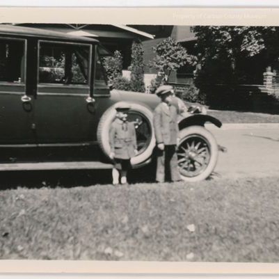 Update 5/2010: Black and white print of two young boys standing beside vintage car. Boys are dressed in suits and caps. Car is square looking with spoke wheels, four doors, running boards with spare tire mounted on. Car is parked on street beside yard with lawn. Across the street are houses with trees and bushes.