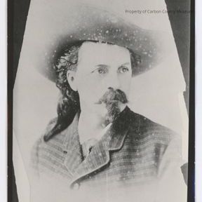 Update - September 2010: Black & white contact print of a man with full mustache & goatee beard. His hair is dark & long & pulled back behind his ears then down his neck & over his right shoulder. He is looking toward photo right. He wears a large brimmed hat & a tweed suit jacket & matching vest with a light colored shirt & a bolo tie. Damages from original have copied - torn corners & light colored spots.