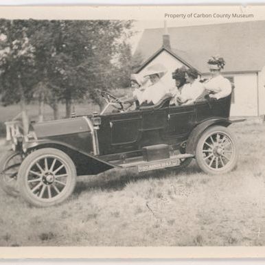 Update 5/2010: Two black and white prints of 5 ladies sitting in a vintage car .They all have on large, ornate hats. One lady has her arms outstretched to steering wheel. The car is open top, 4 door with small box mounted on runny board between doors. A sign hanging from running board reads: "$1300 Marion 30 HP FOB Laramie". A white clapboard building with outside stairs is in background. Written on back in blue ink: "Ruth Rivera, Mrs.. Fisher. Aunty Hetzler at Laramie, Wyo."