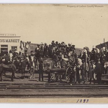 Photo of the Rawlins Horribles, July 4, 1883. Taken at 5th and Front Streets, Rawlins. Established lot 22 block 24. Smith and Adams moved building from Southside to this location in Spring, 1879. P.L. Smith left firm in Sept. 1886. William Ash sold to I.C. Miller, April, 1885. Miller and Smith from April, 1885 to Sept. 1886. Miller and Hurt to Frank Keefe in building in Sept. 1893. B. L. Cannon as Rawlins Meat Market opened in May, 1891 for nine months. C. H. Ketchum purchased Rawlins Meat Market in Oct., 1887.