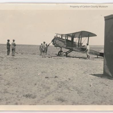 Update 2008: Black and white print. Snapshot. Image of a bi-plane (two winged aircraft) parked in a field with a group of 5 men nearby. A large container can be seen in the right foreground. painted on the body of the plane visible behind the wing "{ma}il 258" all but one man are wearing coveralls; all are wearing caps. Door to engine block is open.