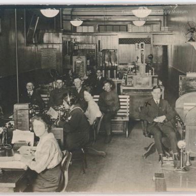 Update 5/2010: Two black and white prints of interior of an office, possibly telephone office. A man sits at a roll top desk on photo right. he is facing forward toward photographer. A table in right foreground has a candlestick telephone on top. In photo left are 3 women working at tables, one has a headset over her ears talking into a telephone receiver on a stand. Other 2 women have vintage telephones near them. Four men sit behind them on a wood slat bench and behind them is another man sitting at a desk. Equipment of some kind is across back wall of the office. Written in black ink on man on right, his shoulder: "X". Written on back in black ink: "X Lion hearted boss, guess you can find me. I was pretty busy just about this time."