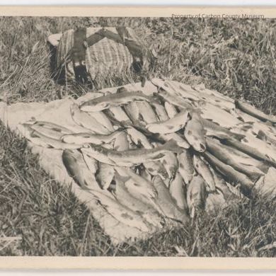 Update 5/2010: Black and white print of many fish laying on a mat next to a creel bag. They appear to be brook trout. Written on the back in black ink: "A days catch on Brooklyn Lake Snowy Range."