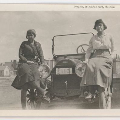 Update 5/2010: Black and white print of 2 women sitting on the front fenders of a vintage car. The license number is "113 Wyo". Written on the back in blue ink: "Ruth & Carmen sitting on Chevrolet at court house in Rawlins."