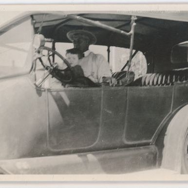 Update 5/2010: Black and white print of man and child sitting behind steering wheel of vintage car. Car has top, open sides, diamond pattern back seat upholstery, 4 doors and spoke wheels. Written on back in pencil: "1920".