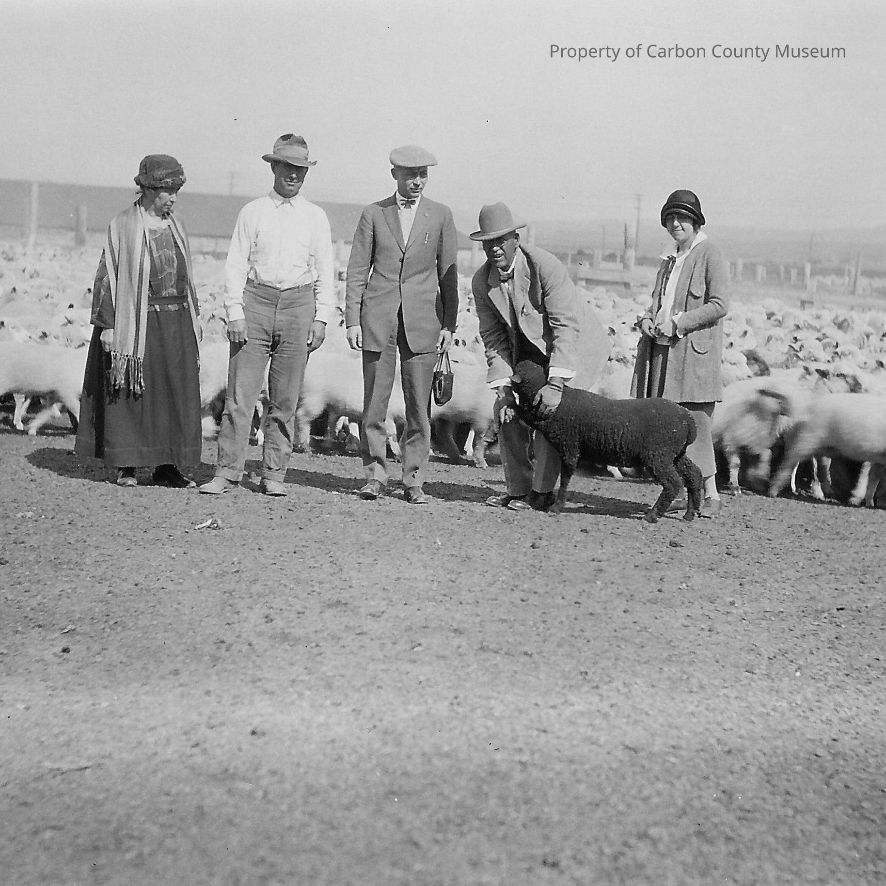 Update 5/2010: Black and white print of 5 people standing in front of a band of sheep. A lady in a long dark dress with striped shawl and dark hat is on far left. Three men are in the middle and the fourth one is leaning over holding onto a black sheep. A lady in a matching coat and skirt and dark hat is on the far right. A large building with pens behind is in the distance. Written on back in pencil: "Rivera".