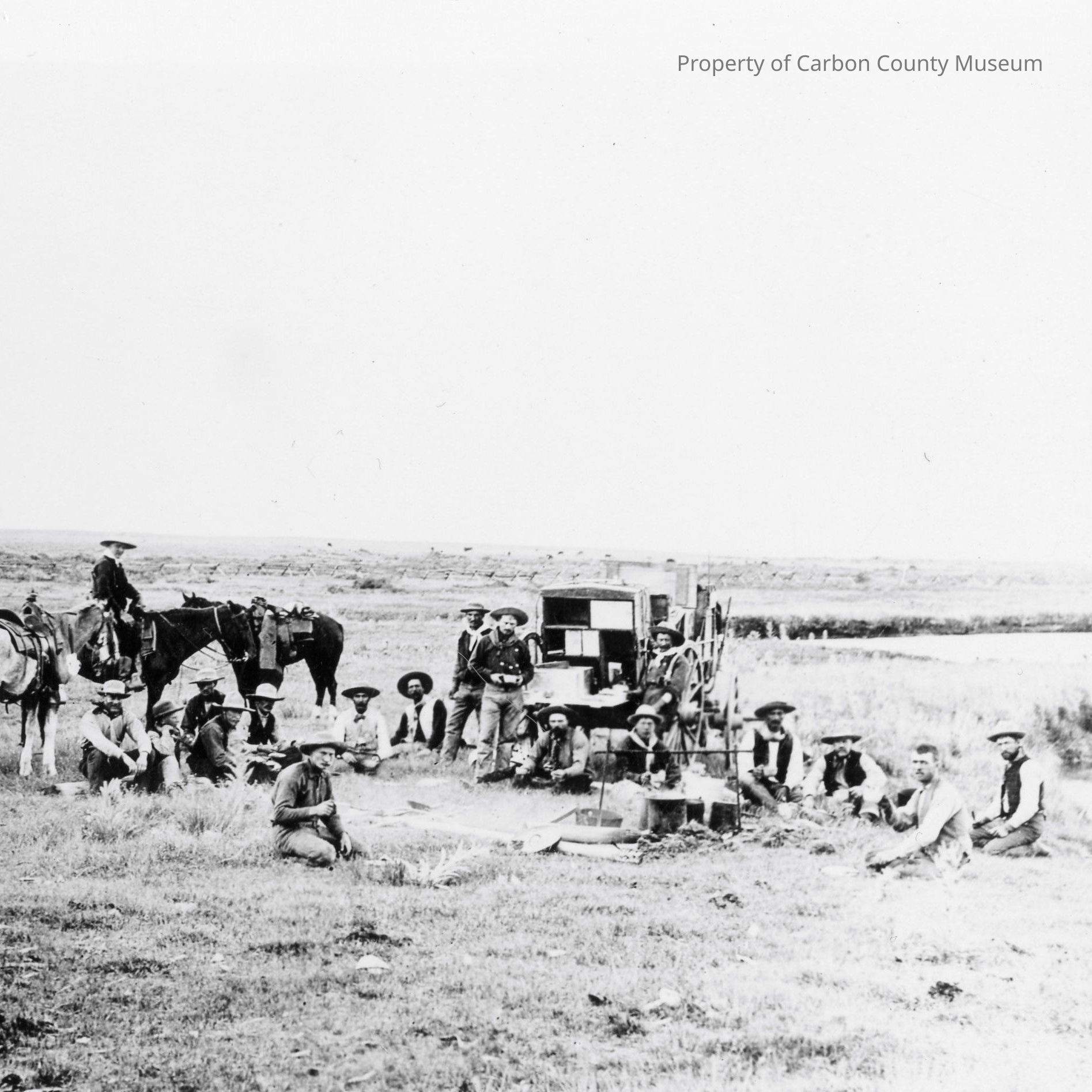 Update - 2009: Black & white print. Snapshot. Image of a group of men & horses gathered near a river. Open chuck box on wagon near river edge at right. Most men seated on the ground. 3 standing near chuck box; 1 mounted. Saddled horses standing at left.