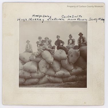 Photo of group of people sitting on wool bales at the Daley Ranch. Taken about 1898-1900. Madge Daley, Celia Smith, Hugh Murray, Jim Rendle, Anna Rendle, Scotty McKay.