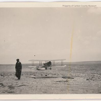 Update 2008: Black and white print. Snapshot. Image of a man in dark clothing and cap walking away from a bi-plane (two-winged aircraft) that is parked on the prairie. Low hills in background.