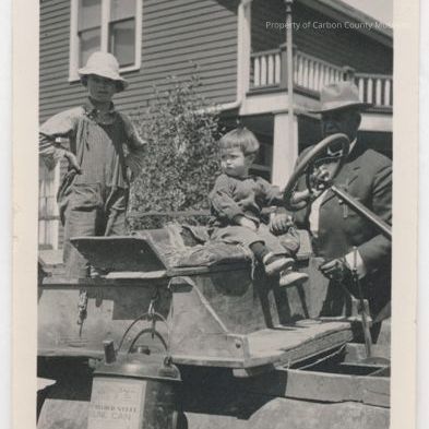 Update 5/2010: Black and white print of a young boy, young girl and a man. Boy is standing behind a wood seat of which the girl is sitting holding onto a steering wheel. The man is standing on the ground beside the girl. A can hangs on wood seat and written on it is: "Welded steel gasoline can". A 2 story clapboard house with balcony is in the background. Written on the back: "Jim, Rawlins".
