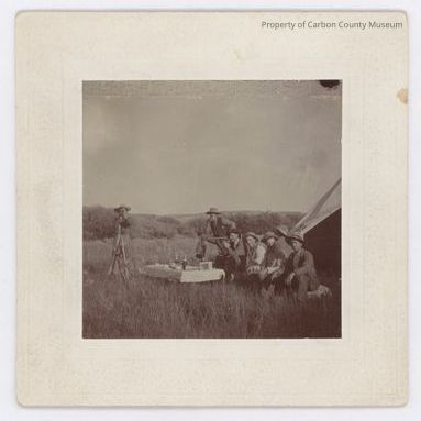 Update 2008: Sepia print. Snapshot. Mounted on patterned white matboard. Image of 7 men gathered around a low cloth-covered table set up in a grassy field. Low hills and shrubs in background. Five men are seated at right. Man at center standing with right toot on a stump; man at left is standing and appears to be looking thru a scope?-hands are up in front of his face holding something. Rifles stacked in front of man at left. Man closest to center seated is sighting down a rifle. Bottles and cups on the makeshift table, tent side can be seen at right edge.