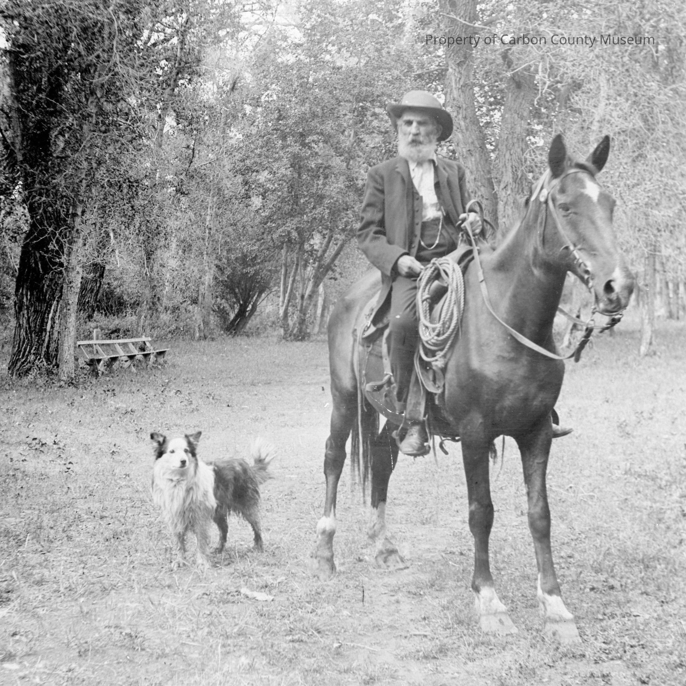 Update February 2011: Black & white print on light grey mat. Image of an elderly man on a horse. The man is wearing a dark three piece suit with vest unbuttoned. A watch chain hangs from vest. He has a hat on, a full grey mustache & beard & holds the reins from the horse's bridle in his left hand. The horse is saddled & a rope is coiled & tied to the saddle. A white & black dog is standing on the ground beside the horse. Tall trees are in the background.