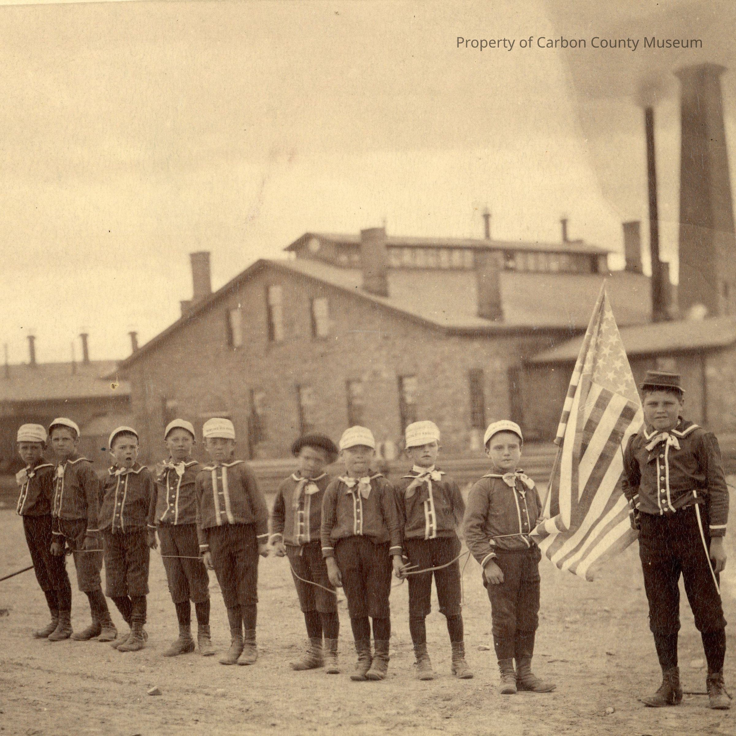 Written on back in blue ink: "left to right 1 [blank] 2 Fred Friend. 3 Jack Naugel 4 [blank] 5 [blank] 6[blank] 7[blank] 8 Roscoe Donnel[sic] 9 Jim Bennett 10 Kleber Hadsell" "The little can[sic] was made in the railroad shops at Rawlins & used for 4th of July celebrations etc." "Donated by Kleber Hadsell - 10 little boys playing soldiers Kleber Hadsell leader.-" "Rawlins, WY"