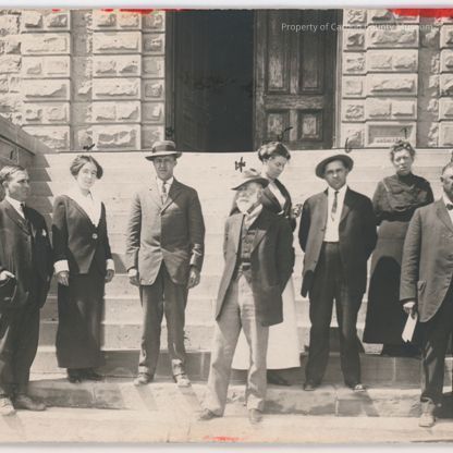 In front of the Carbon County Courthouse: Sheriff Rubie Rivera, Les Magor, Clerk Rich Magor, Sam Parks, Laura Heath, Mildrid McIntosh, Fanny Murry, Harry Hansen. Taken in 1914 by Hugh Rogner.