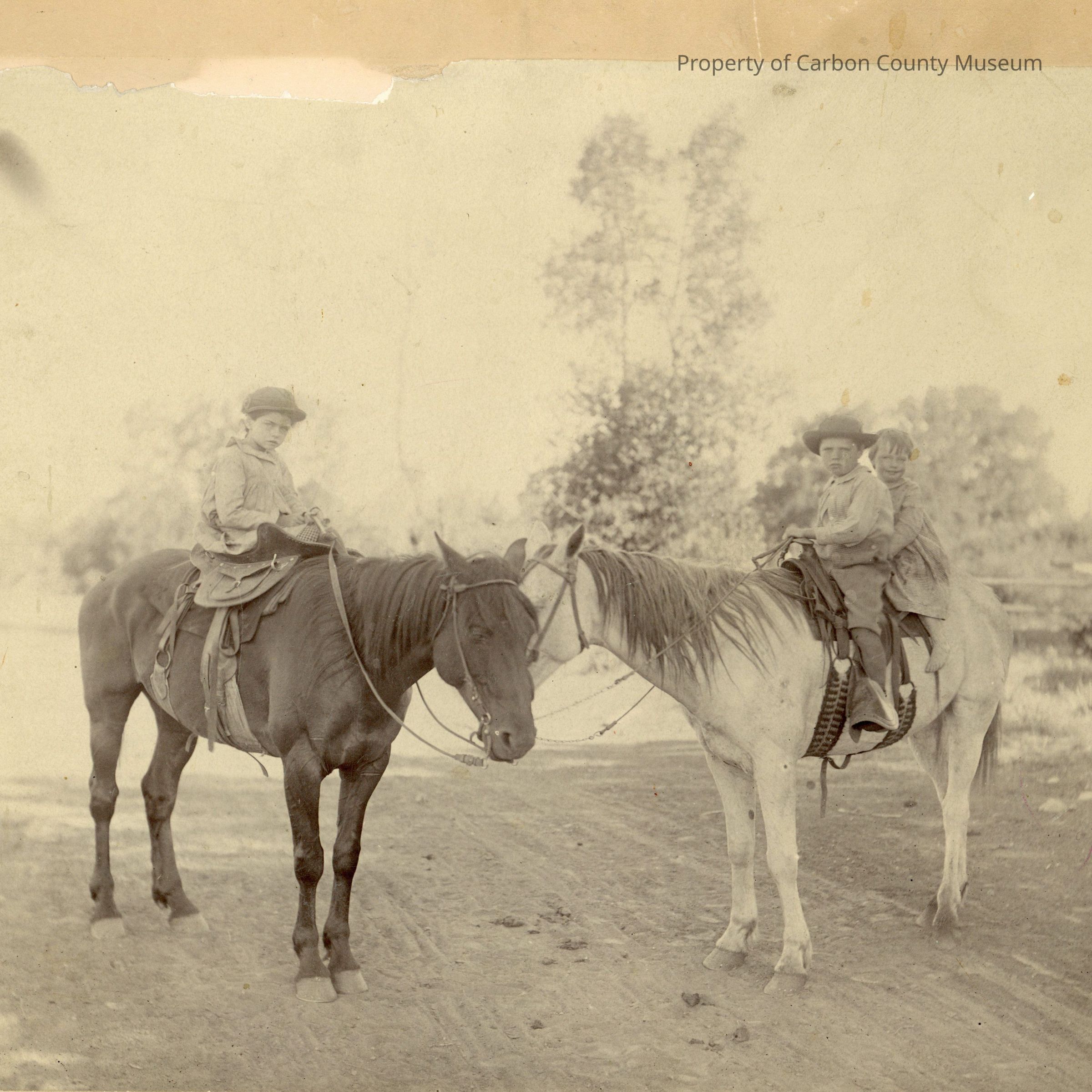 Update - 2009: Sepia? print. Mounted on tan matboard. Image of two horses standing nose to nose on a dirt road. Horses are being ridden by children - one a girl on a sidesaddle on the dark horse at left; two , a boy & a girl astride a western saddle on the white horse at right. Trees & corral fence in background.