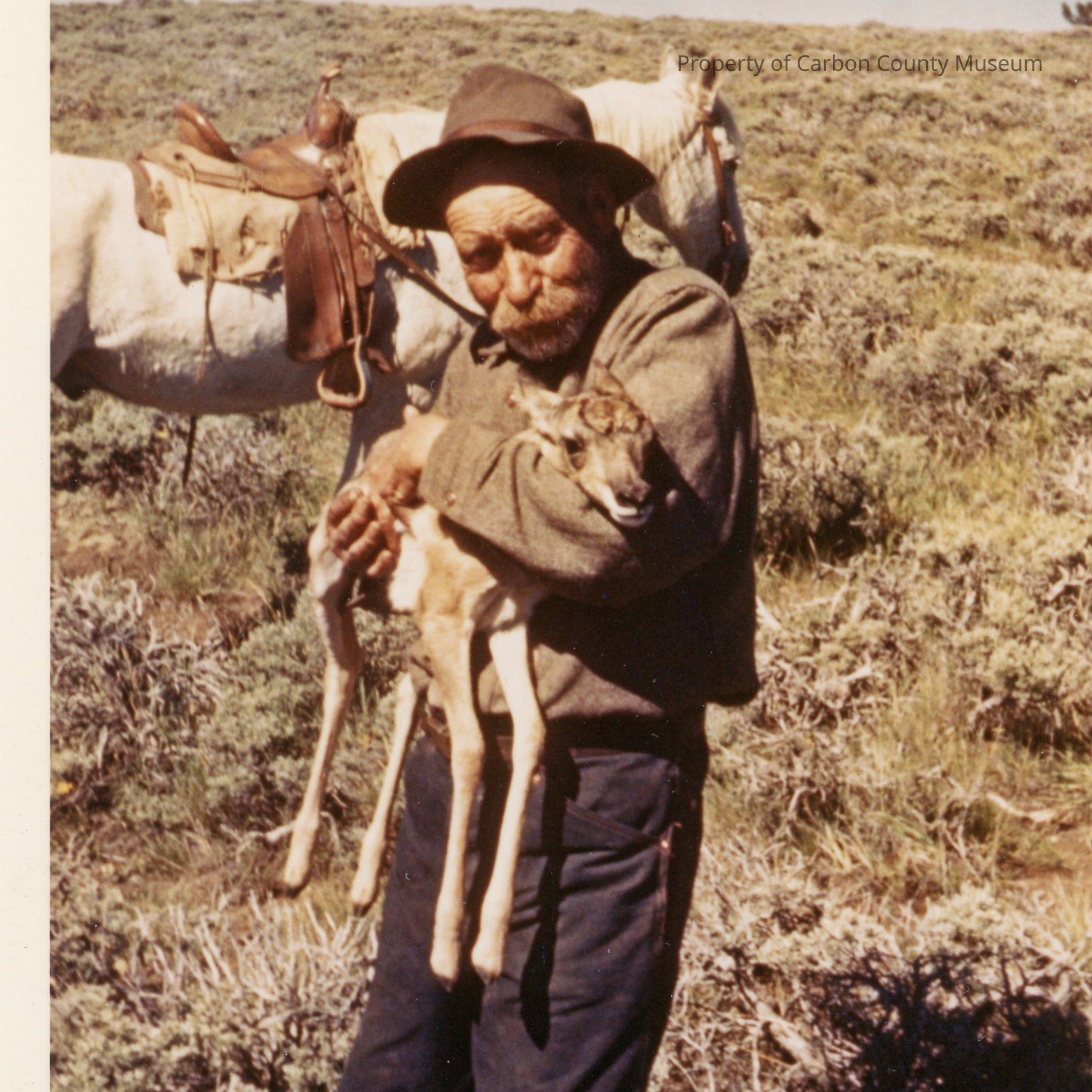 Update 2009: Colored snapshot showing a man dressed in dark blue jeans and tan shirt holding a baby antelope. He has a very bushy mustache and wears a brown brimmed hat. A white saddled horse in back of them. The ground is covered with sagebrush and blue sky at top of photo.