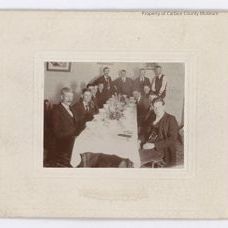 Photo of Owl Club's dinner in Club Room in Rawlins. L to R: Bob Jungquist, Bing Price, Hugh Murray, Ed Bennett, William (Scotty) McKay, ?, Fritz Dennison, W. W. Daley, ?, James Rendle, ?, Turk Batsford. Taken November 19, 1895.