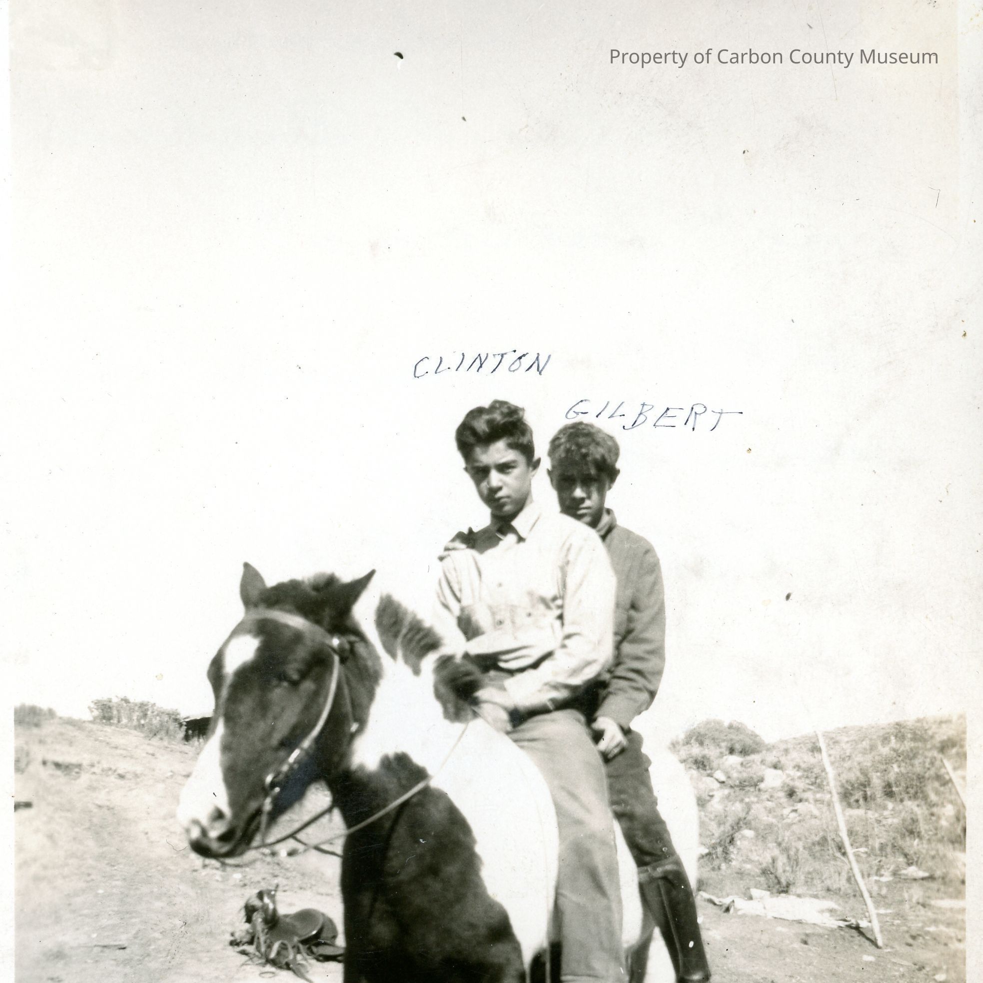 Black and white photograph. Two boys are sitting on a horse, the boy in front is identified as "CLINTON" and the boy behind him is identified as "GILBERT". Writing on the back of the photograph reads as follows: