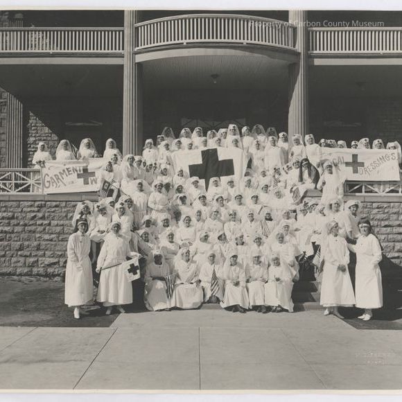 Update 1/2010: Black and white print. Snapshot. Image of a large group of women in white, red cross nursing smocks and hats posed on the steps of a large stone building. Some of the women are on the two-story columned porch of the building. Many of the women are holding American and Red Cross Flags. A large Red Cross is held at top of steps and two banners-one on each side-are held by women on the porch. Banner at left: "Garment + W[orkers]". Banner at right : " [Surgi]cal and Dressings."