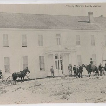 Update 2013: Unframed for conservation purposes. Black and white photograph. Large white wood frame two story building with many windows. Small front portico at center front of building. Dirt/scrub in foreground with young seedlings at various locations. Written on back in blue colored pencil: "This is Hotel Cadwell use to be at the hot springs at Saratoga. Burned down years ago the lady on the horse is Mrs. Cadwell and the man with the whiskers is shoemaker Monk? Mauk? other parties cannot make out. Fred Wolf in buggy shoemaker Maulk holding horse Engineer Emil Jonson Chris Farrer behind Mauk Nobblock? backseat, J. F. Crafford (Crawford?) middle of behind Johnson with derby hat. R Rivera 10-29-26Collection