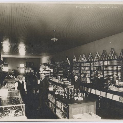 Update - 2009: Black & white print (& two copy prints). Snapshot. Mounted on grey matboard. Image of the interior of a general store. Right wall lined with tall shelves filled with canned goods & other merchandise. Row of counters & display cases in front of shelves. Left wall lined with tall shelves of hard goods - pitchers, cups, plates, etc. Row of glass display cases in front of shelves. Row of displays with merchandise down center isle. Six men in store - two behind counter at right. Lights suspended from ceiling; windows in back wall.