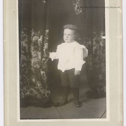 Update July 2011: Black & white studio portrait on grey mat. Image of a young boy standing beside a heavy dark & floral drape. He wears a white, long sleeve shirt with large collar trimmed in eyelet & lace. Cuffs of shirt & front tie have the same trim. he has dark, short pants with three buttons on the outside of legs,dark long socks & lace up shoes. He has on a plaid, flat, short brim hat. His right hand is holding on to the edge of the drape that is parted behind him. Printed on bottom of mat: "Brown Rawlins, Wyo."