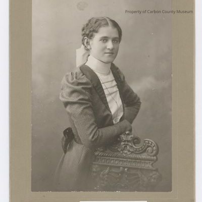 Update February 2011: Black & white print on tan mat. Image of a woman standing with her right arm resting on a chair back. Her dress has a white collar with pleated inset to waist, dark trim at sides of inset & small print, long sleeves & skirt with a dark bow tied at back waist. Her hair is parted in the middle with curls on sides & a white bow tied at back neckline. The chair is a carved wood straight back.