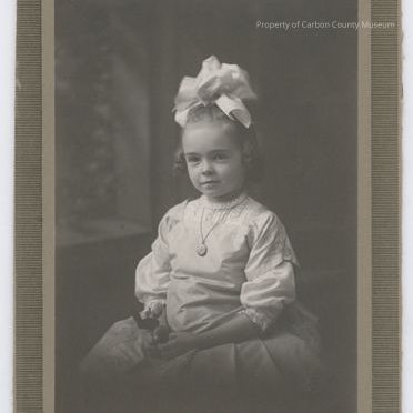 Update February 2011: Black & white studio portrait print on tan with black trim mat. Image of a young girl in a light colored lace blouse with long sleeves. A pinafore dress has cap sleeves & small print. Her hair is in ringlets with a very large bow on the top of her head. She wears a locket necklace on a chain.