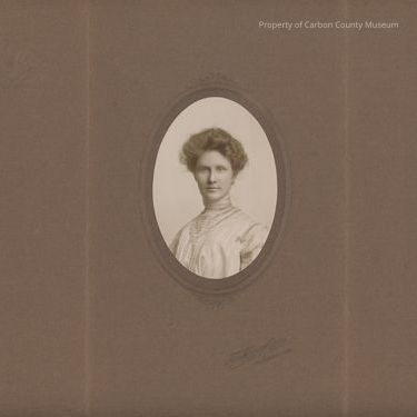 Update 1/2008: Sepia print . Studio portrait. Oval. Mounted in brown and tan cardboard double flap folder. Left front flap embossed with "A Portrait". Head and shoulder portrait of a young woman wearing a light colored blouse/dress with tucks and ribbon accents and high collar. Her hair is pinned up. Embossed on lower right inside under image :"The Ferris Studio, Rawlins, WYO." A decorative oval frame is embossed in folder inside around image. Front left flap edge is feathered.