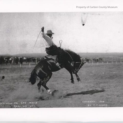 Written on original image at bottom: "Brownell on Gee Whiz Rawlins, Wyo." "Copyright 1908 by M.F. Jukes".