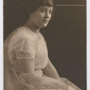 Update 1/2008: Sepia print. Studio portrait. Half length (head to hips) profile portrait of a young woman in a short-sleeved white dress with gauze wrap or overdress. She is wearing a necklace and her hair is pinned up. She has turned her head slightly to look at camera. Embossed in the lower left on emulsion surface: "O.L. Stitt, Photo Rawlins, Wyo."