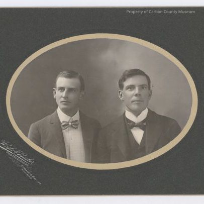 Update 1/2008: Black and white print. Studio portrait, oval. Mounted on dark grey and tan matboard. head and shoulders portrait of two men. Printed backdrop in background. Man at right dressed in dark suit with vest, white shirt, with high stand-up starched collar and black bow tie. Man at left is wearing a dark suit, patterned white shirt and light colored patterned bow tie. Engraved in white on lower left corner of mat: Weyle A. Barber Photographers Laramie and Rawlins Wyoming.