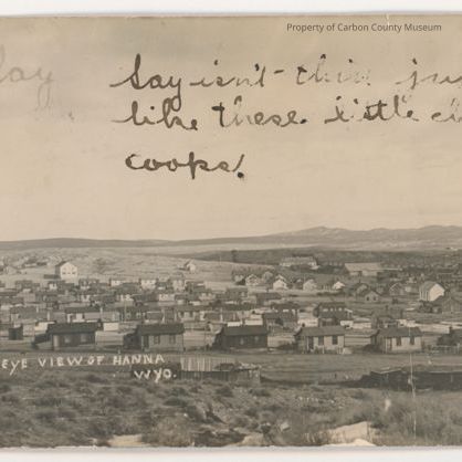 Black and white postcard looking toward the mountain. On the bottom in white print: Birds eye view of Hanna Wyo. Toward the back of the picture a few of the houses look a bit bigger.