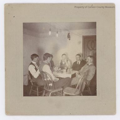 Update February 2011: Black & white print on light grey mat. Image of six men sitting in curved back, wood chairs around a table. An empty chair is at the corner of the table. The men are wearing suits & ties or vests, ties & suits. They appear to be eating as four of them hold an object to their mouth or in their hand. A cord is overhead with two bulbs hanging from it & a cutout of a parrot sitting on a hoop. A dark door is on photo right with two overlapping markings. Cups, a bottle, & tray are on the table. Possibly the Owl Club.