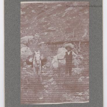 Update 1/2008: Black and white print. Snapshot. Mounted on grey matboard. Image of a man in dark pants, vest, white shirt, and wide brimmed hat standing on rocky ground below a rocky hillside. He is holding a rifle that is resting butt down on the ground. At left is a white equine (horse?) with two deer carcasses strapped to its back. Stirrups can be seen hanging below deer. Dead and fallen tree in midground.