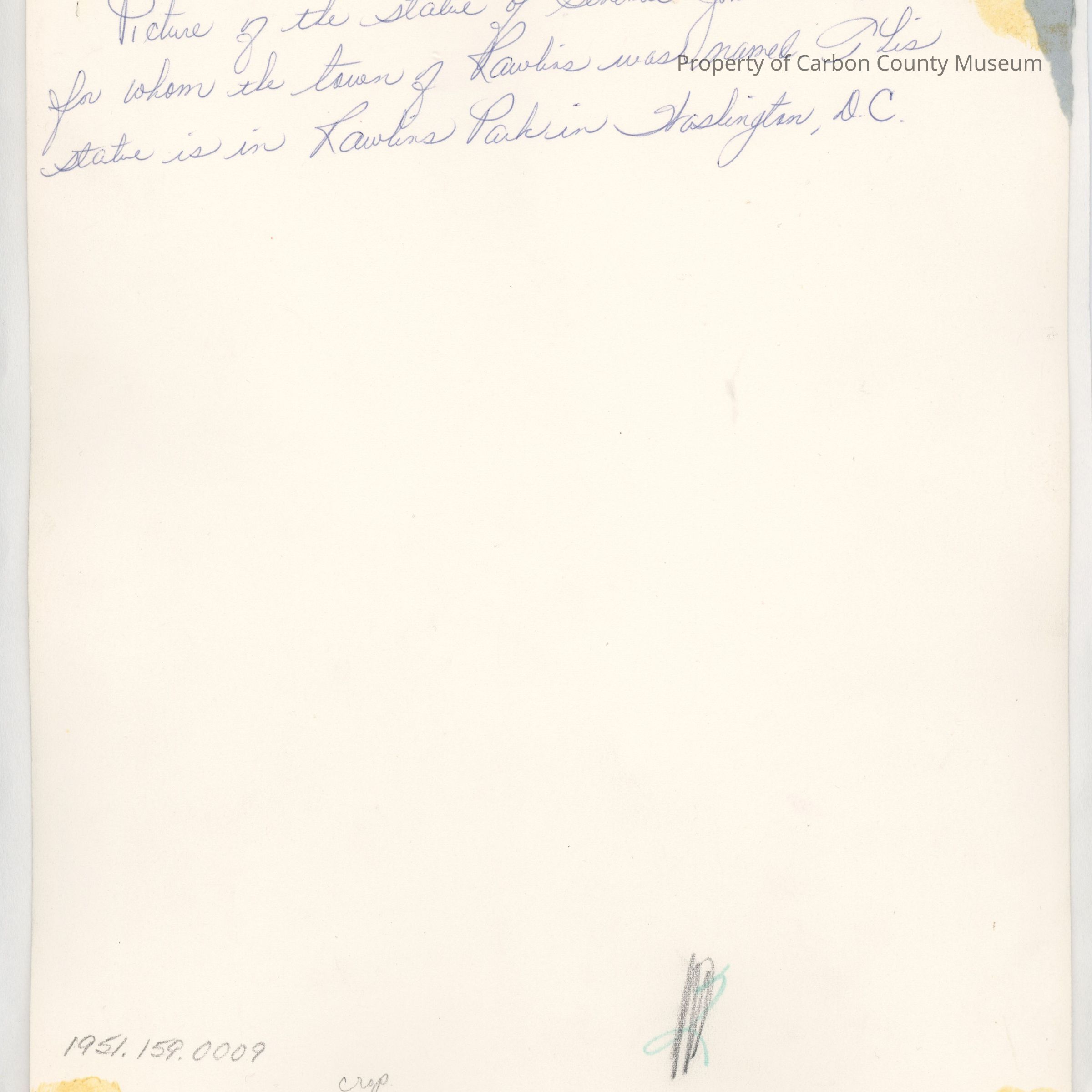 Stamped on back in black ink: "Carbon County Museum Box 52 Rawlins, Wyoming 82301".