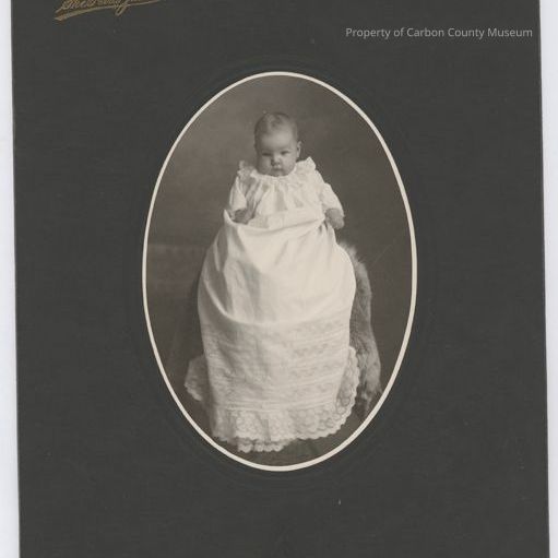 Update 1/2008: Black and white print. Studio portrait, oval, mounted on black matboard. Full length portrait of an infant in a long white christening dress with eyelet lace around skirt. Infant is propped up in a fur covered chair(?). Painted backdrop behind. Engraved in gold in upper left on mat: "The Ferris Studio".