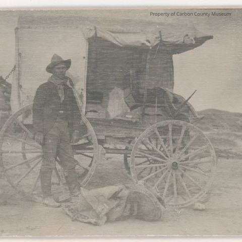 Written on back in black ink: "Billy Collins standing by the stage. This was the last type stage coach used. It carried mail from Rawlins to Lander and discontinued in 1906, and automobiles replaced it. At one time Mr. Collins was with the stage and horses had to swim Separation Creek and he put the mail on top of the stage. This picture was taken in 1904, Mr Collins was 23 yrs. of age." Neg. No. 5238" "Printed in black: "Copy Provided by the Wyoming State Archives and Historical Department."