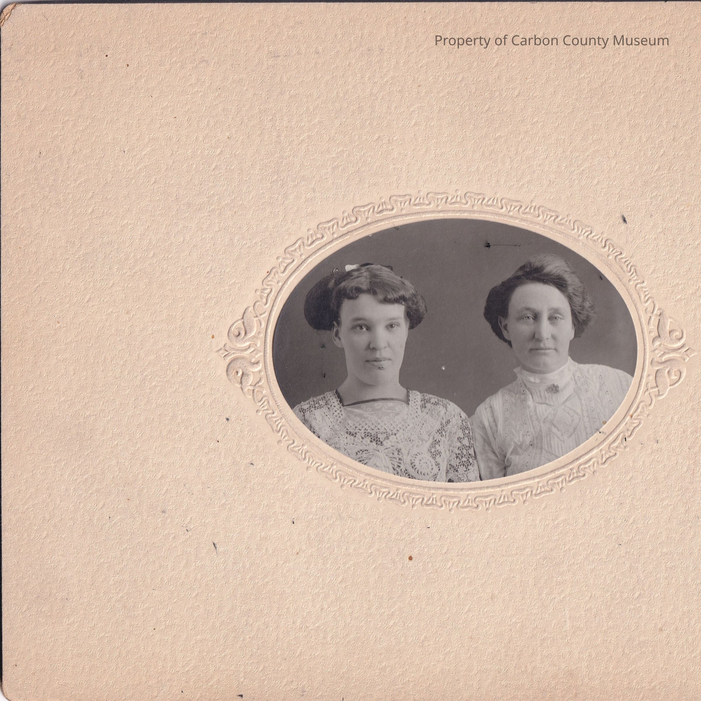 Cabinet card photograph with oversized card, black and white portrait of two women. Card features embossed border around the photograph, imprint on card reads "Passionore Portraits & Views". Written on the reverse is the following "L. Bring Educators 31 years old. Sept 16th 1911".Collection